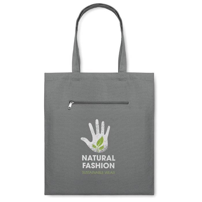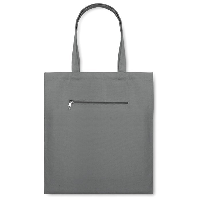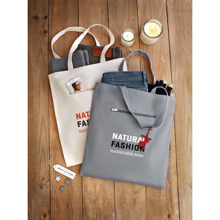 Canvas shopping bag with short handles and front zipped pocket. 280 gr/m².