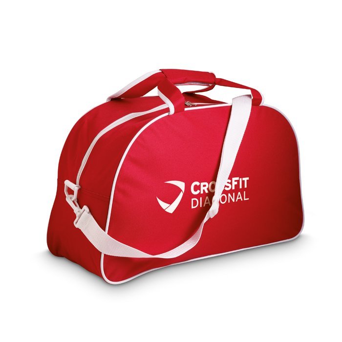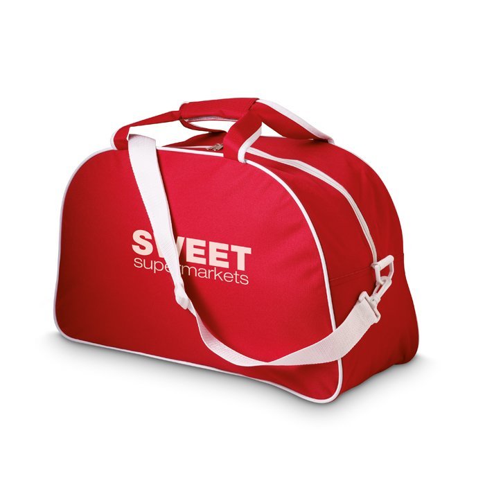 Sports bag with detachable shoulder strap in coloured 600D polyester with PVC backing and white piping.