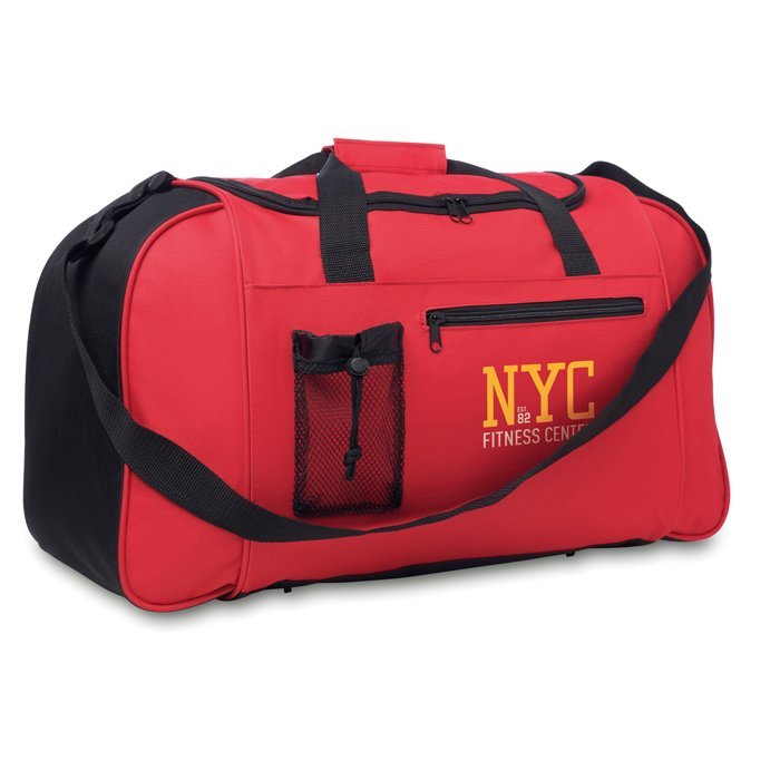 Bright coloured sport or travelling bag in 600D polyester with front pocket and adjustable and detachable shoulder strap.