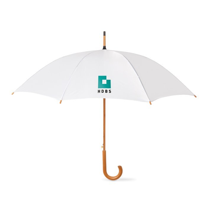 23 inch auto open umbrella in 190T polyester with wooden shaft, tips and top. Black plated metal ribs. Curved natural finish wooden handle. Automatic closure.