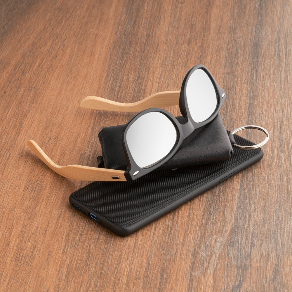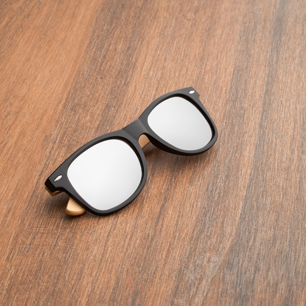 PP and bamboo frame sunglasses. Mirrored lenses and UV400 protection. 46 x 49 x 150 mm